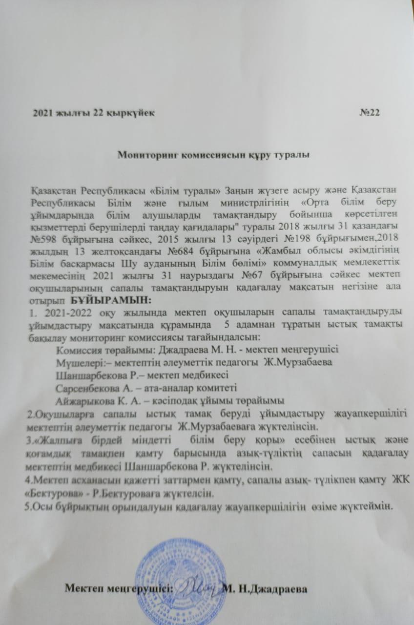 Бракераж комиссиясын құру туралы 2021-2022 оқу жылы