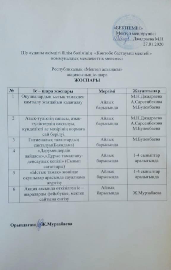 "Мектеп асханасы" акциясының іс-шара жоспары