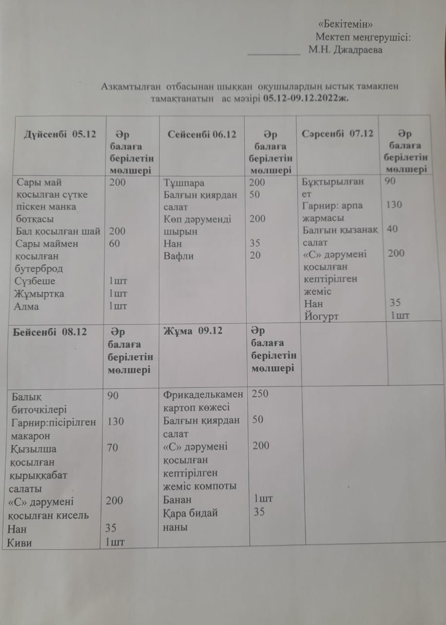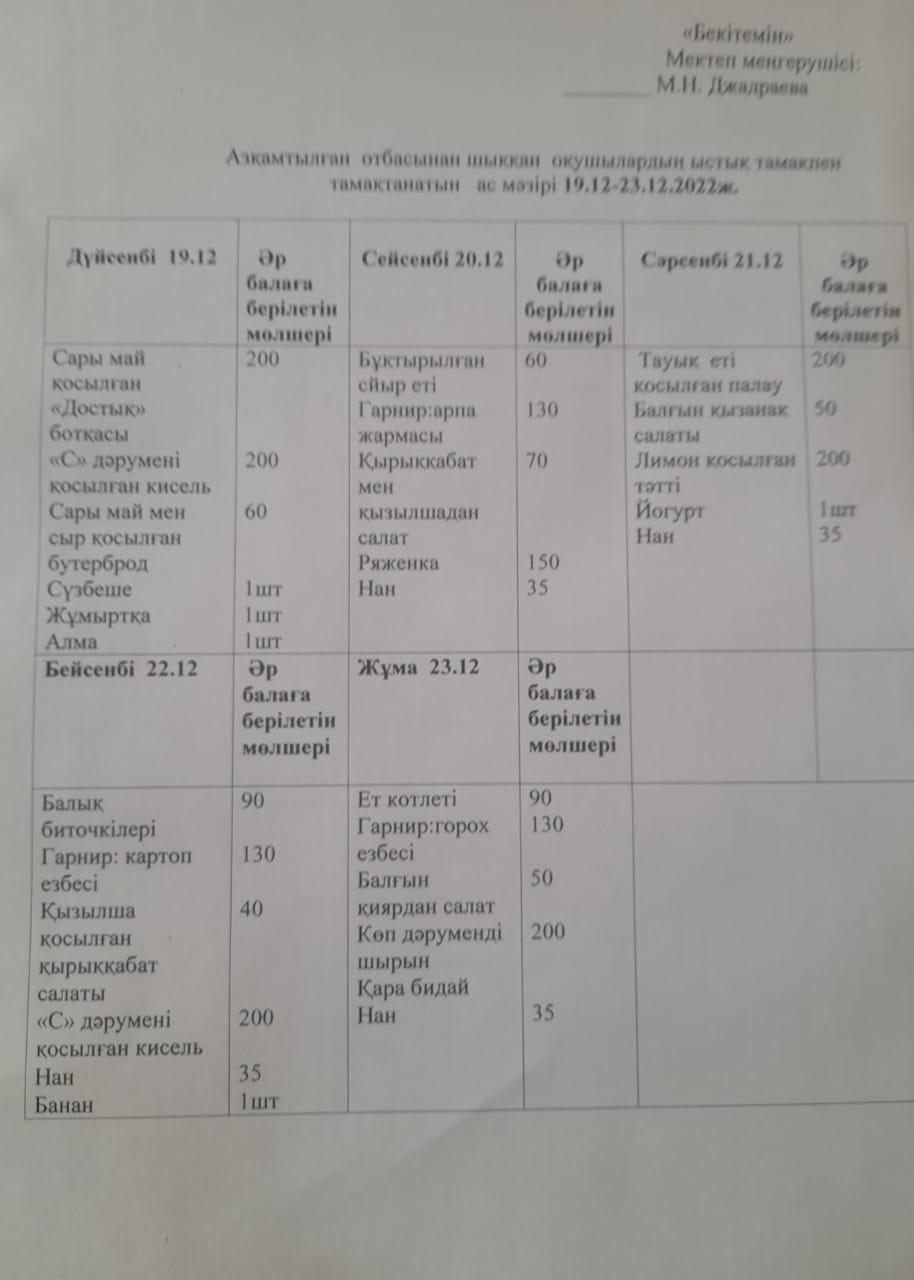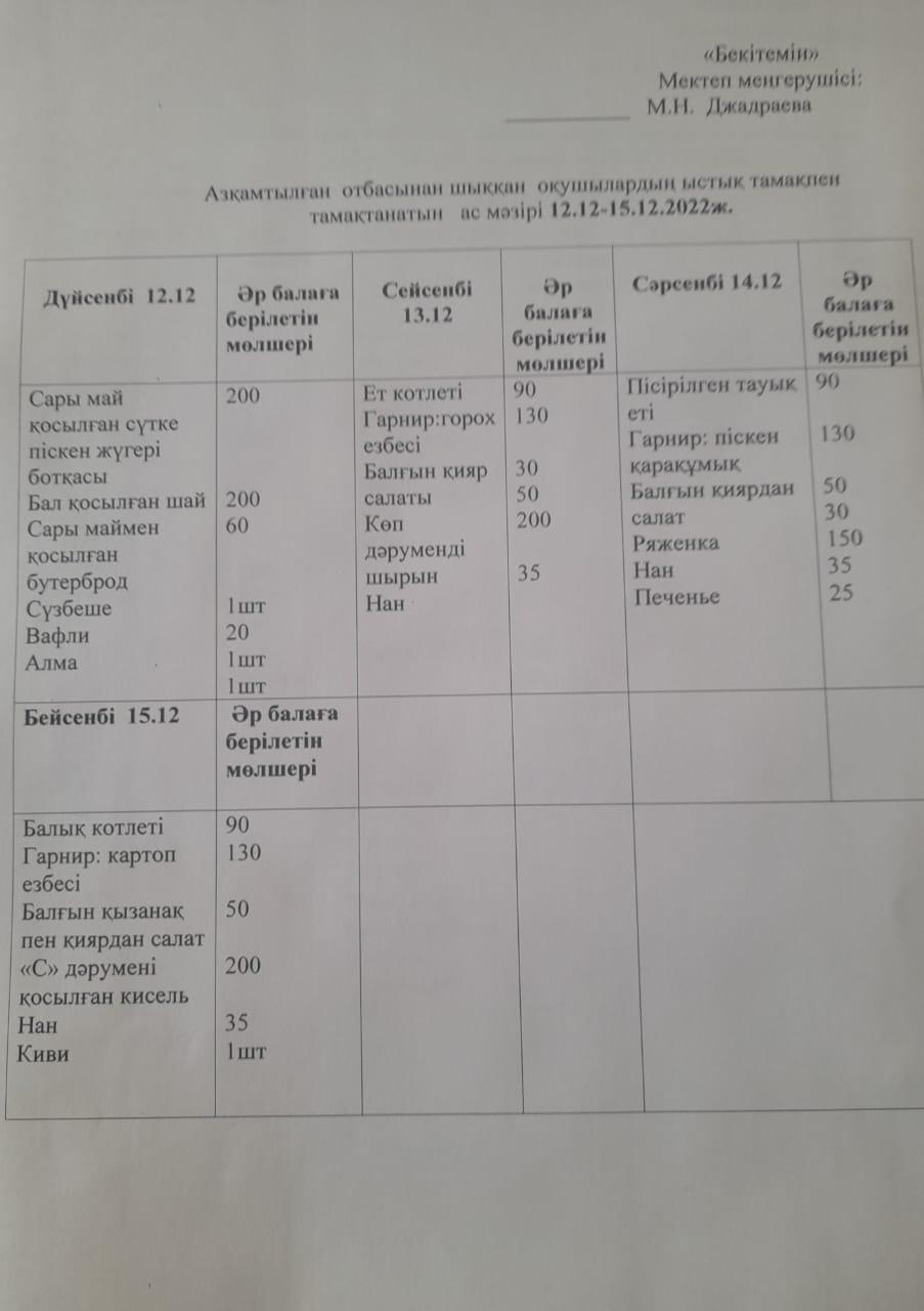 » Оқушылардың ыстық тамақпен тамақтанатын ас мәзірі